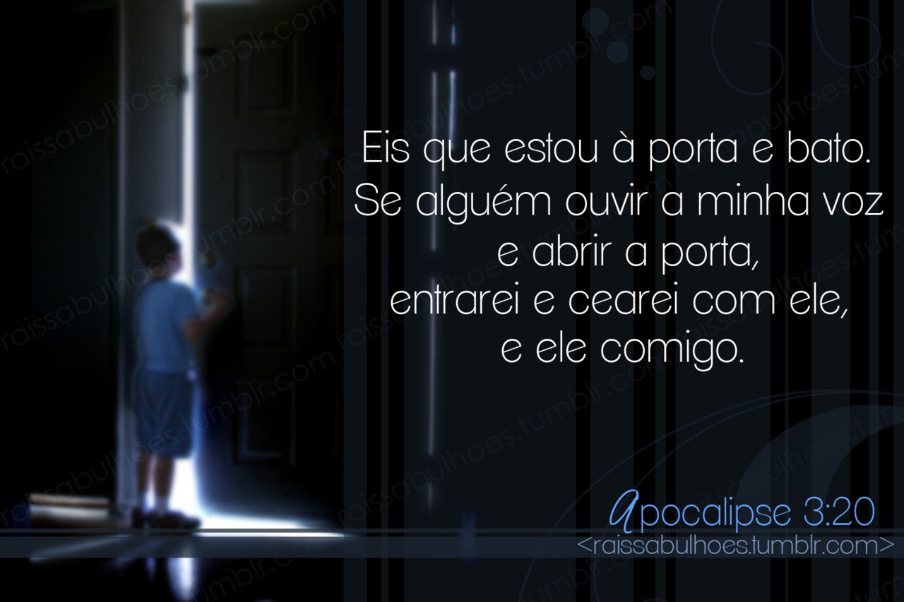 Eis que estou à porta e bato. Se alguém ouvir a minha voz e abrir a porta, entrarei e cearei com ele, e ele comigo.
