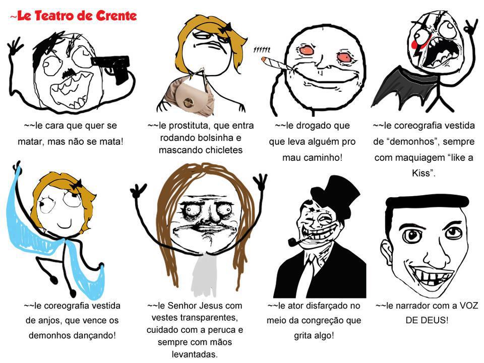 O cara que quer se matar mas não se mata, a prostituta que entra rodando bolsinha e mascando chicletes, o drogado que leva alguém pro mau caminho, a coreografia vestida de demônios sempre com maquiagem like a Kiss, a coreografia vestida de anjos que vence os demônios dançando, o Senhor Jesus com vestes transparentes com peruca e sempre com mãos levantadas, o ator disfarçado no meio da congregação grita algo e o narrador com a voz de Deus.