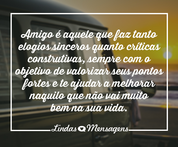 Amigo é aquele que faz tanto elogios sinceros quanto críticas construtivas, sempre com o objetivo de valorizar seus pontos fortes e te ajudar a melhorar naquilo que não vai muito bem na sua vida.