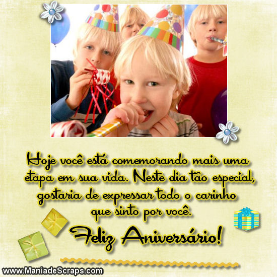 Categorias Aniversário Tags Alegria, ano de vida, carinho, Comemoração, comemorando, crianças, dia especial, dia tão especial, etapa, expressar, Feliz Aniversário, Festa, gostaria, hoje, por você, presente, vida