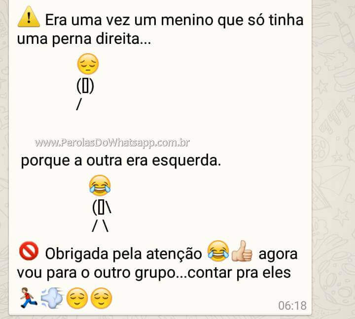 Um menino 31 de maio de 2017 Por adminut Era uma vez um menino que só tinha uma perna direita… Por que a outra era a esquerda. O brigada pela atenção.