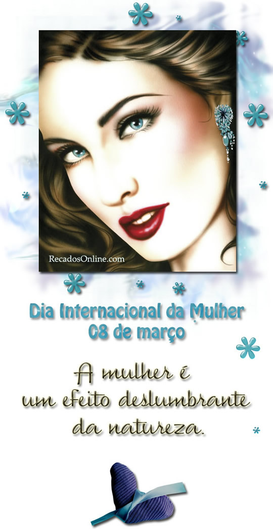Dia internacional da mulher 7 de março de 2013 Por Rosane Dia internacional da mulher: 08 de março A mulher é um efeito deslumbrante da natureza