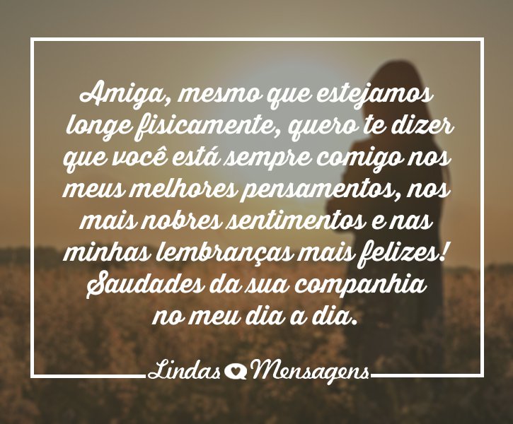 Sinto sua falta amiga, mas quero que saiba que eu sempre penso em você e o meu sentimento pela nossa amizade continua o mesmo! Estou com muitas saudades de você.