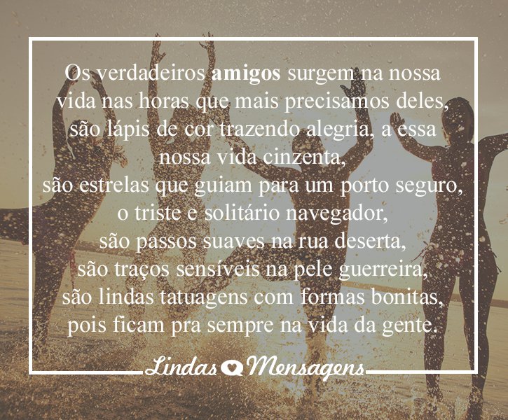 Mas o destino nos apresenta amigos, os quais não sabíamos que iam cruzar o nosso caminho. Muitos desses denominados amigos do peito, do coração. São sinceros, são verdadeiros. Sabem quando não estamos bem, sabem o que nos traz alegria…