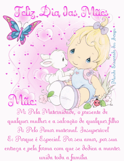 Feliz dia das mães Mãe: M: pela maternidade, o presente de qualquer mulher e a salvação de qualquer filho A: pelo amor maternal insuperável E: proque é especial. Por seu amor, por sua entrega e pela forma com que se dedica a manter unida toda a família.