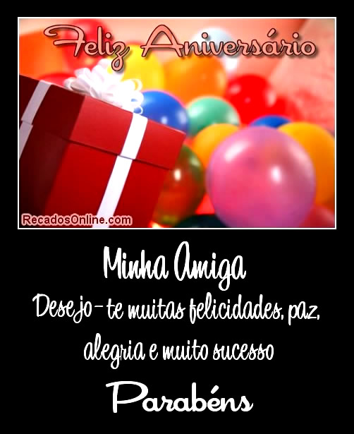 Minha amiga, parabéns! 8 de fevereiro de 2013 Por Rosane Feliz aniversário minha amiga Desejo-te muitas felicidades, paz, alegria e muito sucesso. Parabéns!