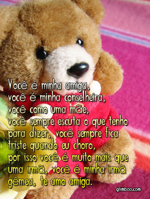 Categorias Amizade Tags amiga, amigas, Amizade, carinho, chorar, choro, conselheira, dizer, escuta, fica triste, irmã, irmã gêmea, mãe, mais que uma irmã, mensagem, ouve, quando eu choro, quando fico triste, te amo amiga, Triste, tristeza, ursinho, urso, você é minha amiga