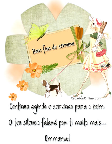 Bom fim de semana Continua agindo e servindo para o bem. O teu silêncio falará por ti muito mais… (Emmanuel)