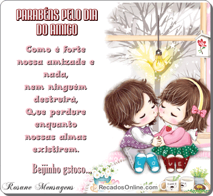 Parabéns pelo dia do amigo! Como é forte nossa amizade e nada, nem ninguém destruirá, que perdure enquanto nossas almas existirem. Beijinho gostoso…