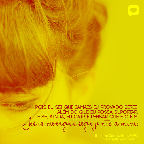 Pois eu sei que jamais eu provado serei além do que eu possa suportar. E se, ainda, eu cair e pensar que é o fim, Jesus me ergue e segue junto a mim.