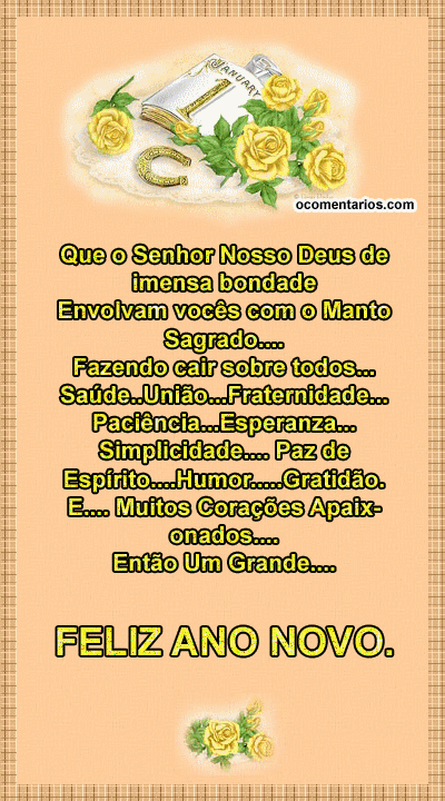 Categorias Ano Novo Tags Ano Novo, Bondade, Comemoração, Contagem regressiva, Deus, envolvam, Esperança, Feliz Ano Novo, Festa, Fim de Ano, Fraternidade, gratidão, Humor, mensagem, Paciência, Reveillon, Saúde, Senhor, simplicidade, união