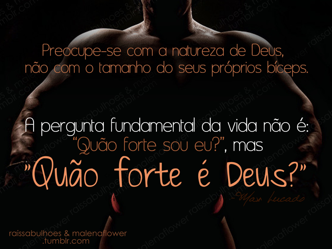 Preocupe-se com a natureza de Deus, não com o tamanho dos seus próprios bíceps. A pergunta fundamental da vida não é: “Quão forte sou eu?”, mas “Quão forte é Deus?”. (Max Lucado)