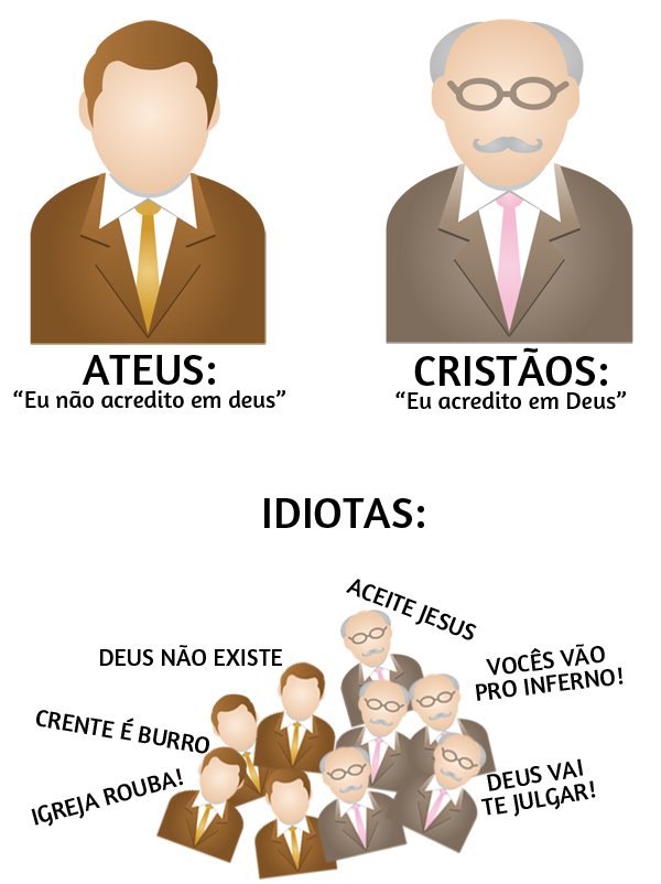 Ateus: “Eu não acredito em Deus.” Cristãos: “Eu acredito em Deus.” Idiotas: Deus não existe. Aceite Jesus. Vocês vão pro inferno! Crente é burro. Igreja rouba. Deus vai te julgar.