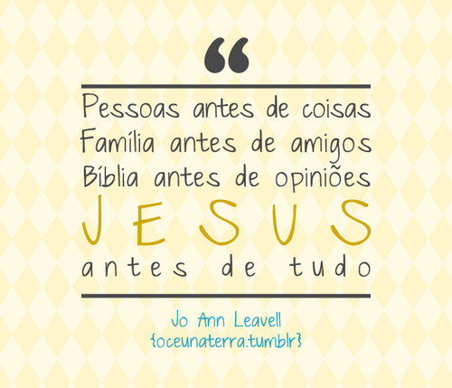 Pessoas antes de coisas, família antes de amigos, Bíblia antes de opiniões, Jesus antes de tudo. (Jo Ann Leavell)