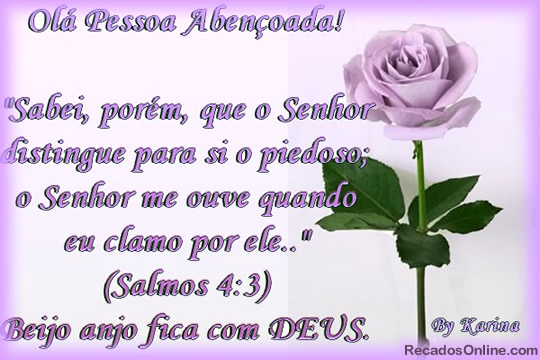 Olá pessoa abençoada! “Sabei, porém, que o Senhor distingue para si o piedoso; o Senhor me ouve quando eu clamo por ele…” Salmos 4.3 Beijo anjo, fica com Deus!
