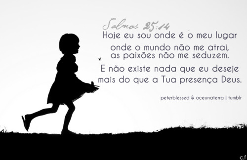 O segredo do SENHOR é com aqueles que o temem; e ele lhes mostrará a sua aliança. Salmos 25.14 Hoje eu sou onde é o meu lugar, onde o mundo não me atrai, as paixões não me seduzem. E não existe nada que eu deseje mais do que a Tua presença, Deus.