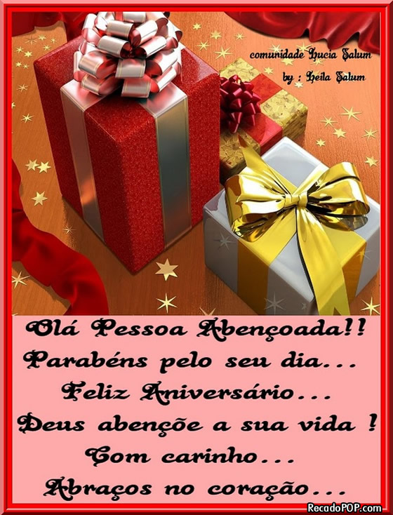 Categorias Aniversário Tags Comemoração, comemorar o aniversário, data especial, Deus abençoe, dia especial, felicidades, Feliz Aniversário, feliz niver, festa de aniversário, muitas felicidades, muitos anos de vida, parabéns, parabéns pelo seu dia, presentes, presentes de aniversário, sua vida, vamos comemorar, vários presentes