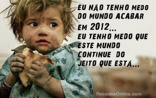 Não tenho medo do mundo acabar… 20 de dezembro de 2012 Por Rosane Eu não tenho medo do mundo acabar em 2012… Eu tenho medo que este mundo continue do jeito que está.