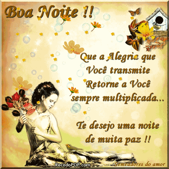 Boa noite! Que a alegria que você transmite retorne a você sempre multiplicada… Te desejo uma noite de muita paz!