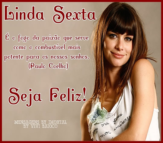 Linda sexta! É o fogo da paixão que serve como combustível mais potente para os nossos sonhos. (Paulo Coelho) Seja feliz!