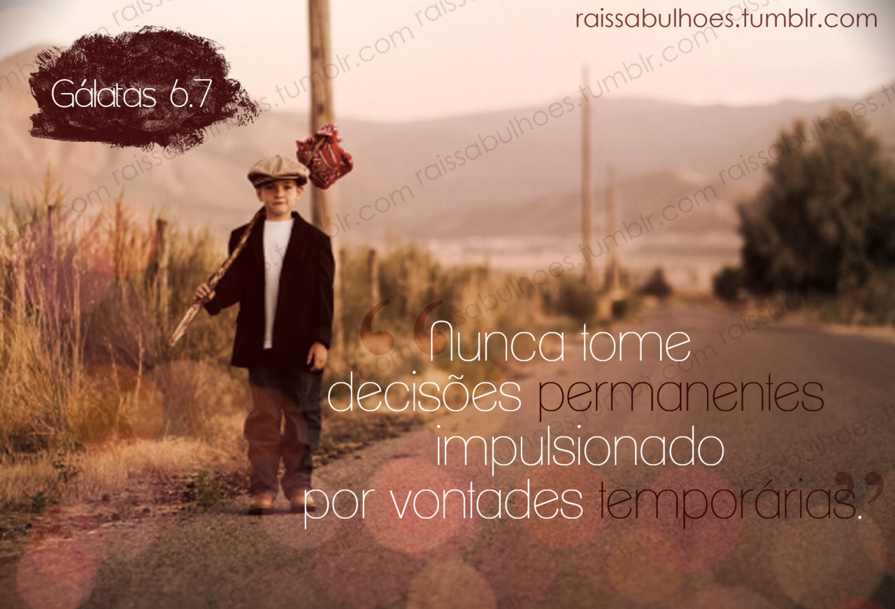 Nunca tome decisões permanentes impulsionado por vontades temporárias. Não erreis: Deus não se deixa escarnecer; porque tudo o que o homem semear, isso também ceifará. Galatas 6.7