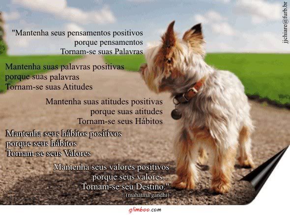 Categorias Linda Mensagem Tags Alegria, amiga, amigas, amigo, amigos, Amizade, amizades, atitudes, cachorrinho, cachorro, caminho, cão, destino, estrada, hábitos, mensagem, palavras, Paz, pensamento, pensamento positivo, pensamentos positivos, positivo, recadinho, Recado, tornam-se, transforma, transformam-se, valor, valores