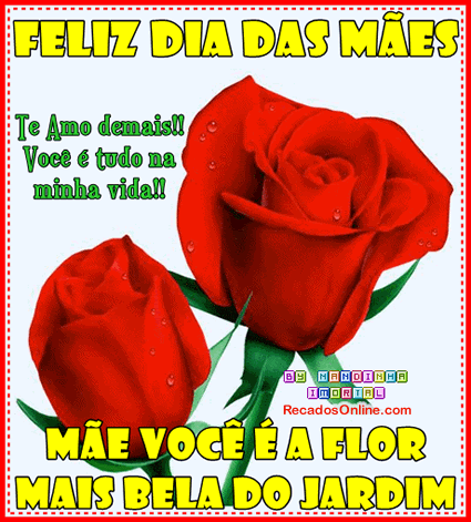 Feliz dia das mães! Te amo demais!!! Voce é tudo na minha vida! Mãe você é a flor mais bela do jardim.