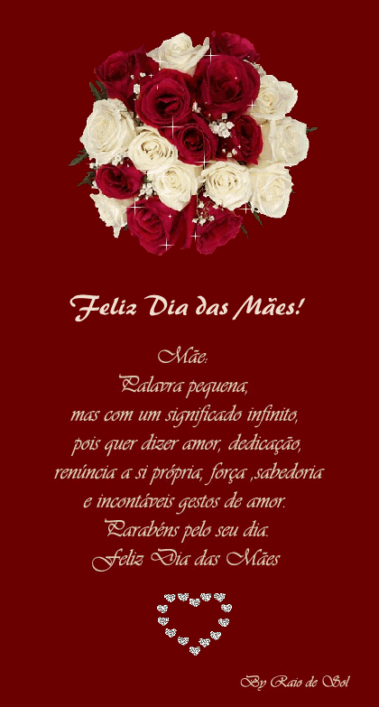 Feliz dia das mães! Mãe… Palavra que Deus inventou Um anjo que à terra chegou Voando nas asas do amor. Mãe… Palavra mais doce que o mel Talvez um pedaço do céu Que Deus transformou em mulher.