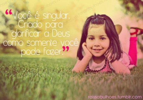 Você foi criado para glorificar a Deus! 12 de julho de 2012 Por rosah Você é singular. Criado para glorificar a Deus como somente você pode fazer.