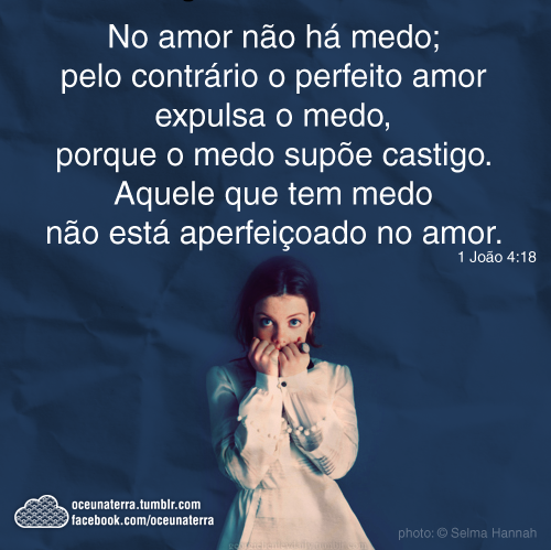 “No amor não há medo; pelo contrário, o perfeito amor expulsa o medo, porque o medo supõe castigo. Aquele que tem medo não está aperfeiçoado no amor.” 1 João 04.18