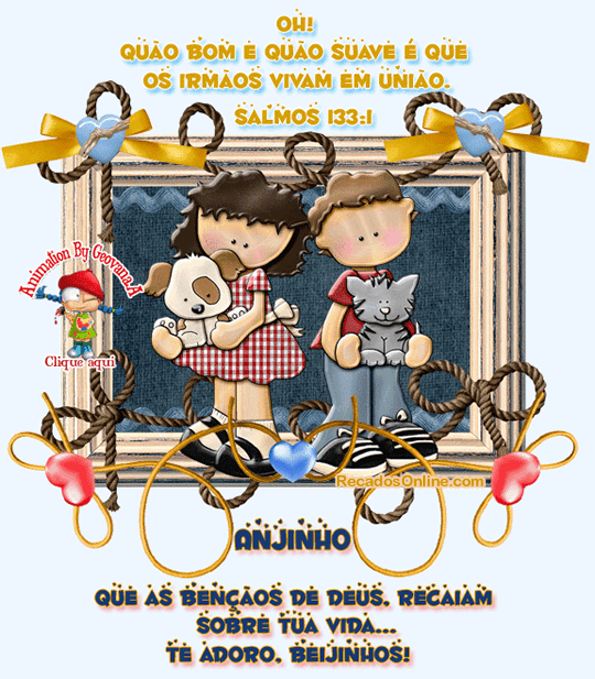 “Oh, quão bom e suave é que os irmãos vivam em união.” Salmos 133.1 Anjinho, que as bençãos de Deus recaiam sobre a tua vida… te adoro, beijinhos!